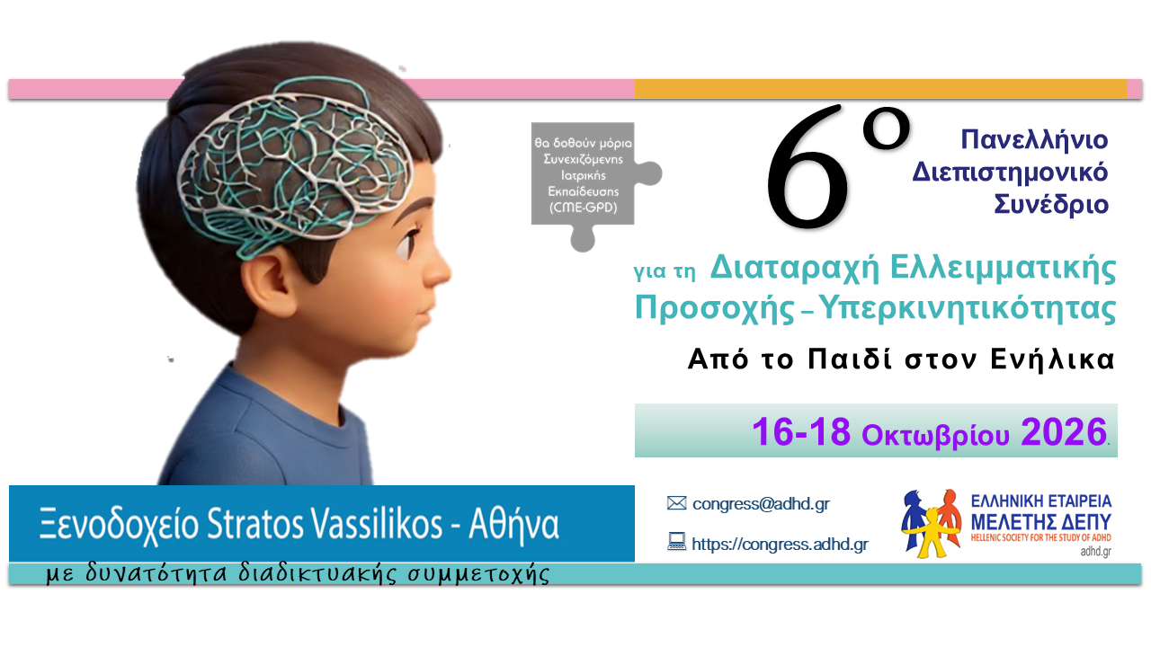 6ο Πανελλήνιο Διεπιστημονικό Συνέδριο για τη Διαταραχή Ελλειμματικής Προσοχής – Υπερκινητικότητας “Από το Παιδί στον Ενήλικα”